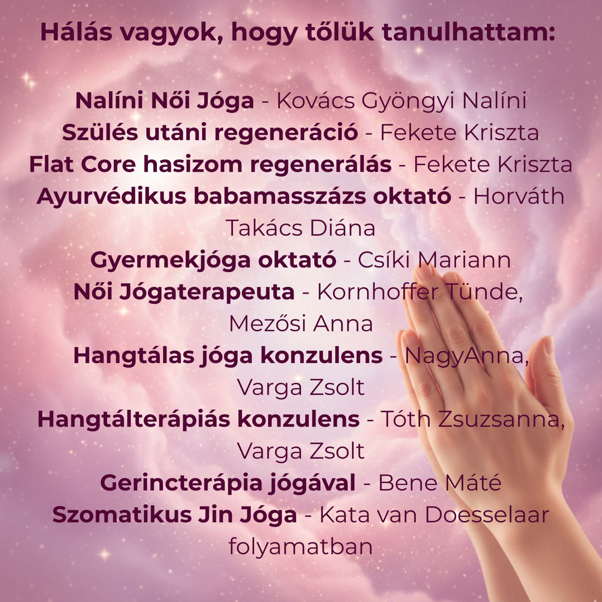 A női jógaoktatói képesítés megszerzése életem egyik legjobb döntése volt. Ahogy ez lenni szokott, a tanítványokkal együtt új kérdések, új élethelyzetek és újabb megoldandó problémák is érkeztek. Ez indított el azon az úton, hogy folyamatosan képezzem magam, és egyre több módszert sajátítsak el annak érdekében, hogy a lehető legjobban tudjam támogatni a hozzám forduló nőket.